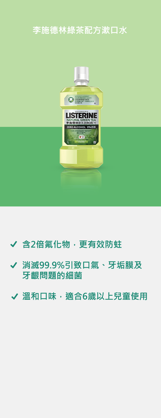 李施德林漱口水能有效消滅引致蛀牙的細菌,保持口氣清新,令口腔全面潔淨。