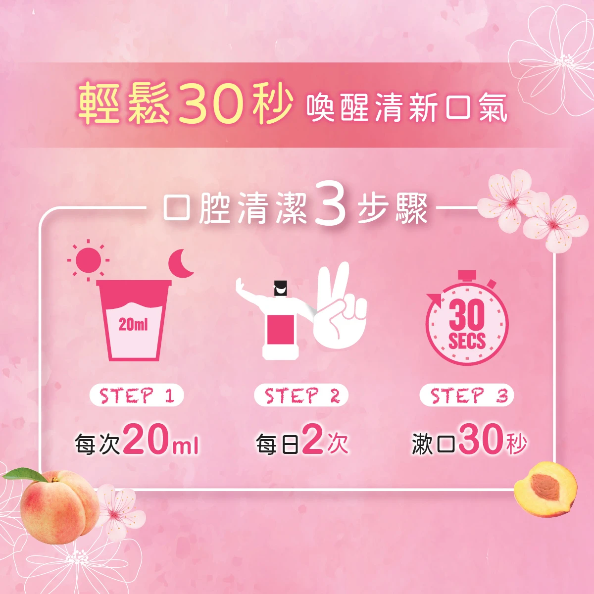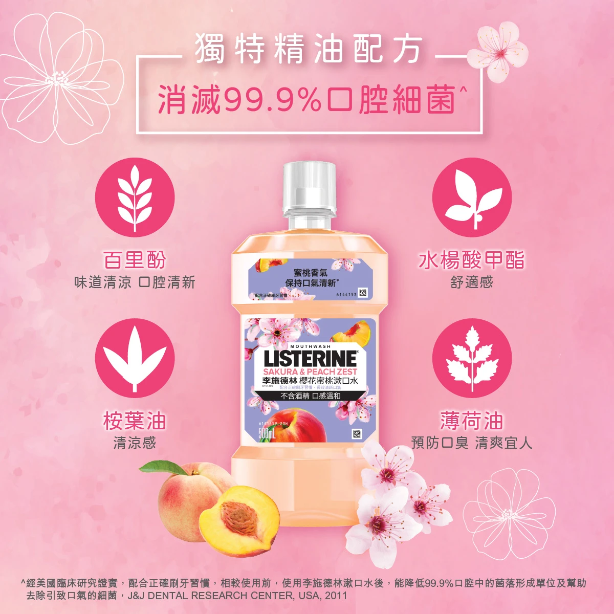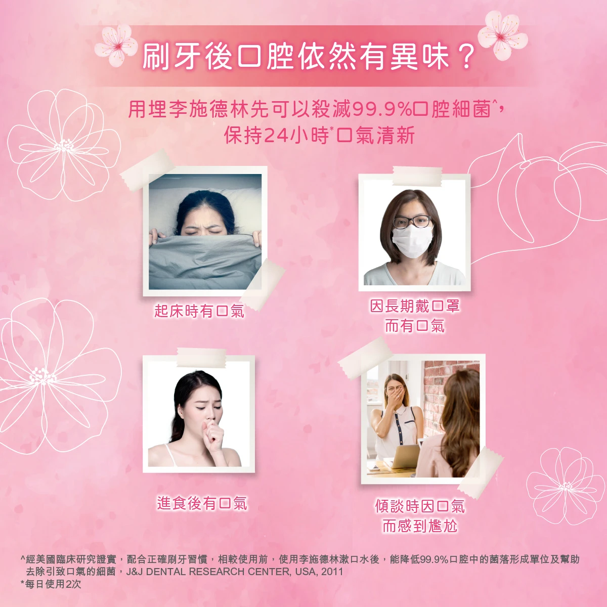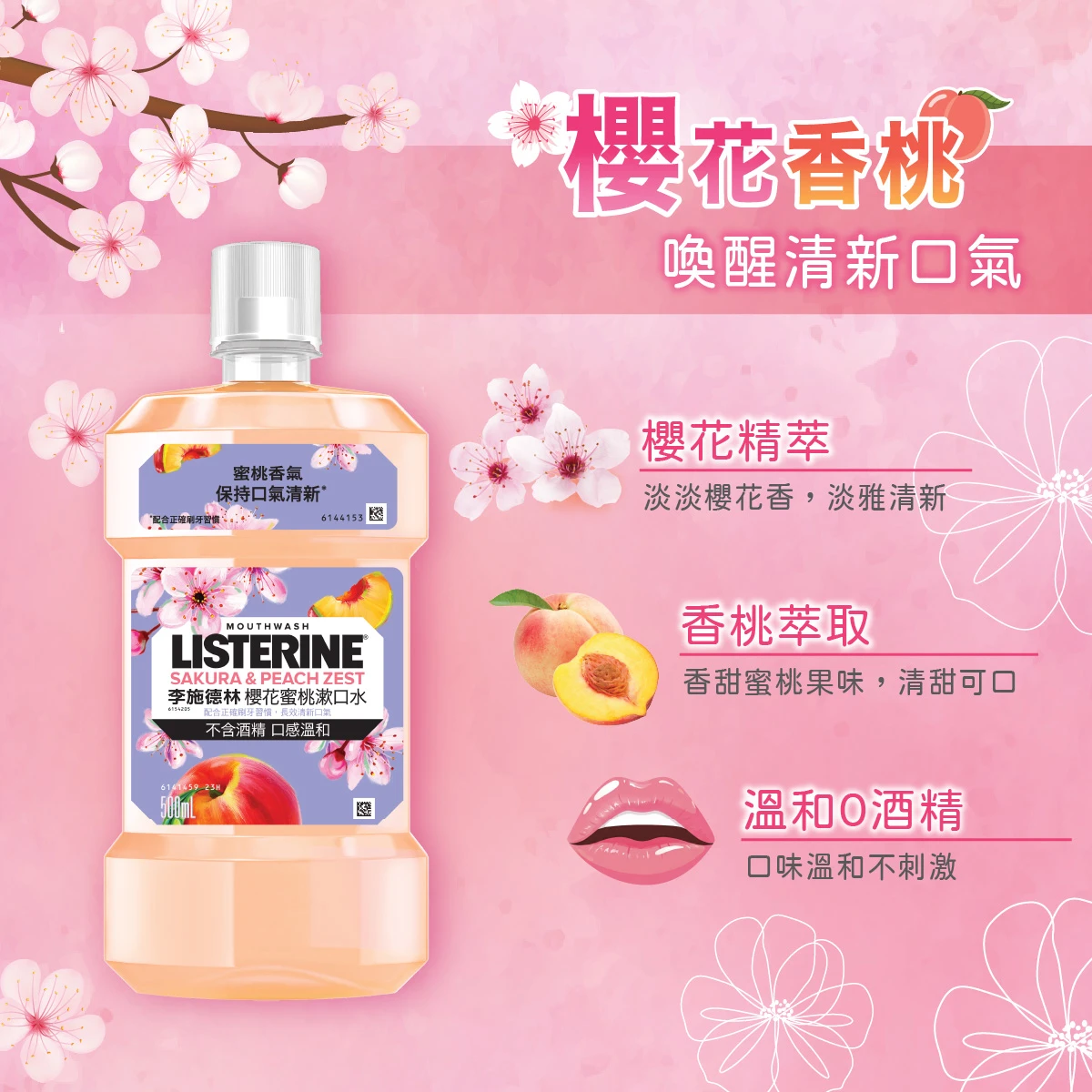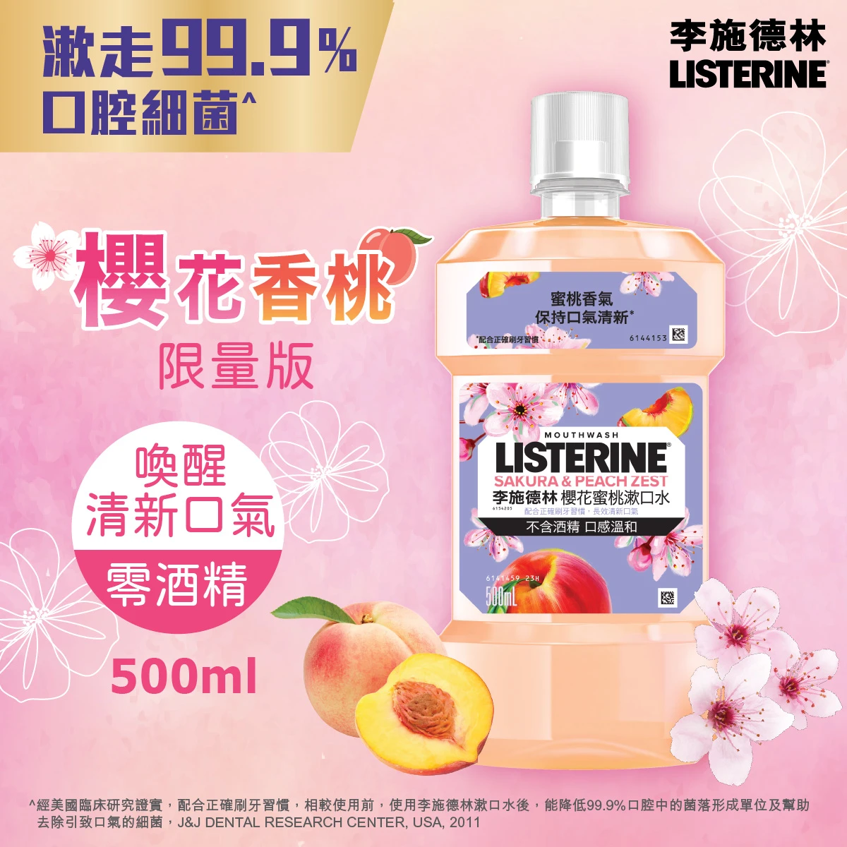 早晚刷牙後使用李施德林,為口腔提供全日24小時保護,對抗引致口氣、牙垢膜及牙齦問題的細菌,限定櫻花香桃口味,清新怡人。