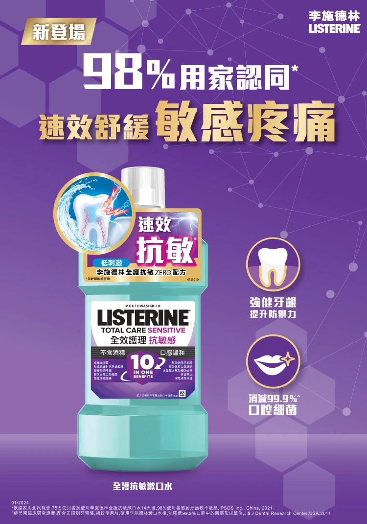 早晚刷牙後使用李施德林全護抗敏ZERO配方漱口水,全面潔净口腔,同時有效舒緩牙齒敏感問題